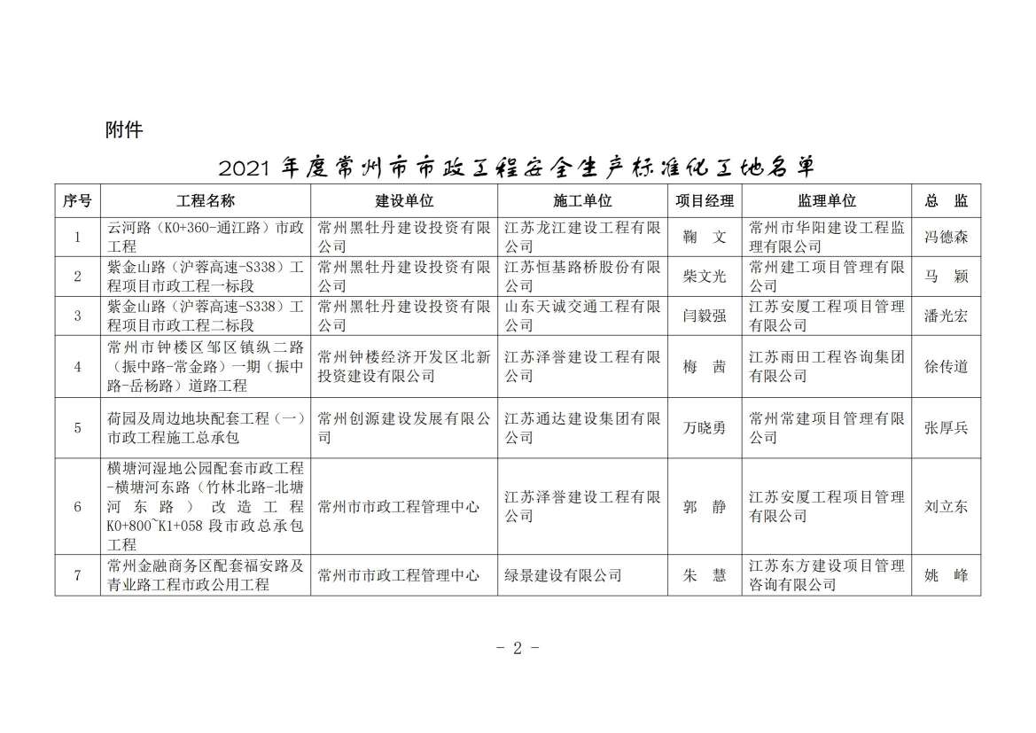 中国常州网讯 记者从常州市住房和城乡建设局获悉,经现场考核、评审、网上公示等程序,云河路(K0+360-通江路)市政工程等43项工程获评“2021年度常州市市政工程安全生产标准化工地”称号。(李垚)