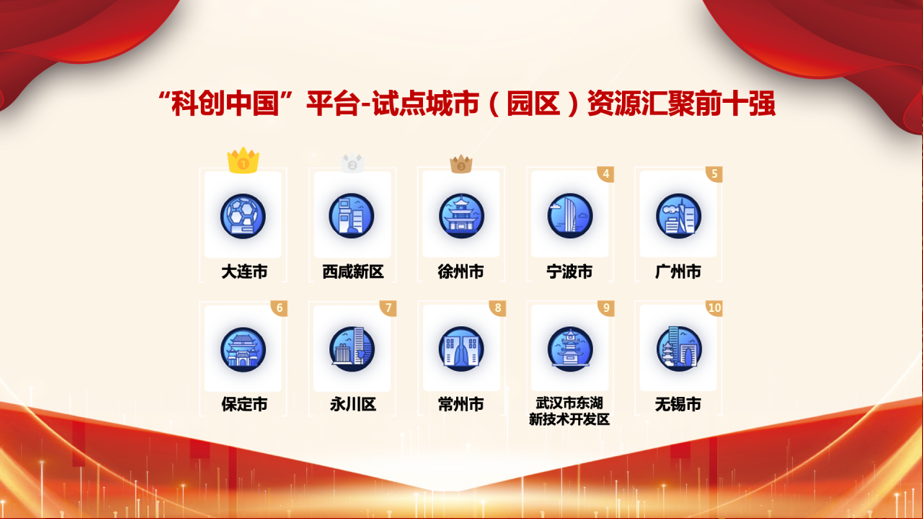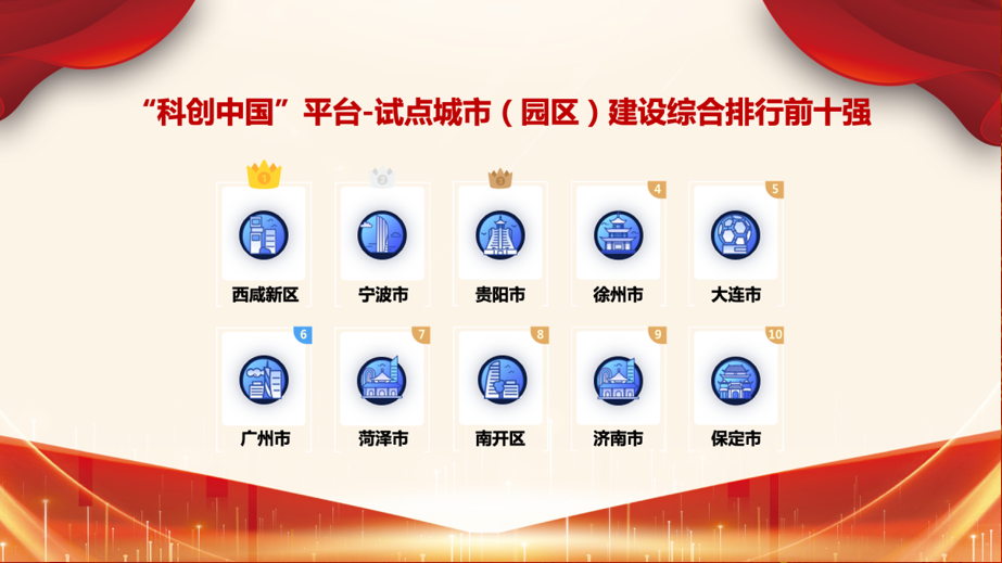 截至2021年底,“科创中国”平台-试点城市建设综合排行前十强的城市有:陕西西咸新区、浙江宁波、贵州贵阳、江苏徐州、辽宁大连、广东广州、山东菏泽、天津南开区、山东济南、河北保定。“科创中国”平台-试点城市资源汇聚前十强有辽宁大连、陕西西咸新区、江苏徐州等,转化对接前十强有江西南昌国家高新区、陕西西咸新区、内蒙古包头等,推介传播前十强有山东菏泽、贵州贵阳、山东济南等。