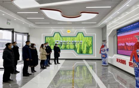 接着来到襄阳正大有限公司百万吨饲料厂。跟着讲解员的引导,调研组来到企业展厅观看宣传片,参观正大可视化生产车间与卸料棚,了解百万吨饲料生产线的工序流程。座谈会上,双方就如何提升企业创新能力、优化产品结构、培养科研人才等工作展开讨论。