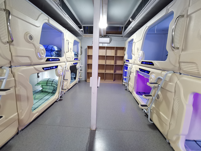 除了火车民宿之外,太空舱民宿也独具特色、别具一格,是基地为游学的孩子们提供的特色民宿,模拟太空生活环境。每个舱设有睡眠仓区、行李区、洗漱区,并配有专属舱卡,可以调节不同颜色的灯光及控制空调风量,深受青少年喜爱。