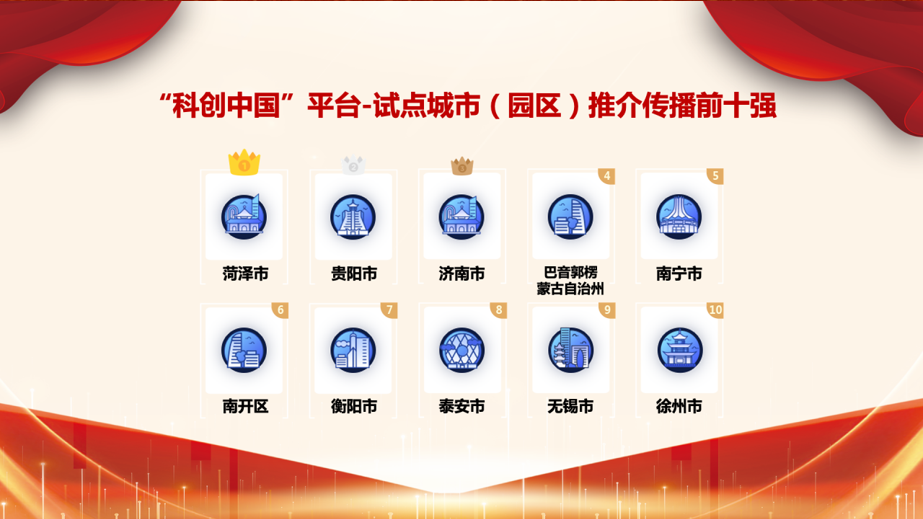 截至2021年底,“科创中国”平台-试点城市建设综合排行前十强的城市有:陕西西咸新区、浙江宁波、贵州贵阳、江苏徐州、辽宁大连、广东广州、山东菏泽、天津南开区、山东济南、河北保定。“科创中国”平台-试点城市资源汇聚前十强有辽宁大连、陕西西咸新区、江苏徐州等,转化对接前十强有江西南昌国家高新区、陕西西咸新区、内蒙古包头等,推介传播前十强有山东菏泽、贵州贵阳、山东济南等。
