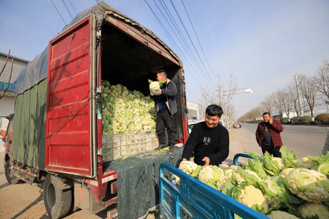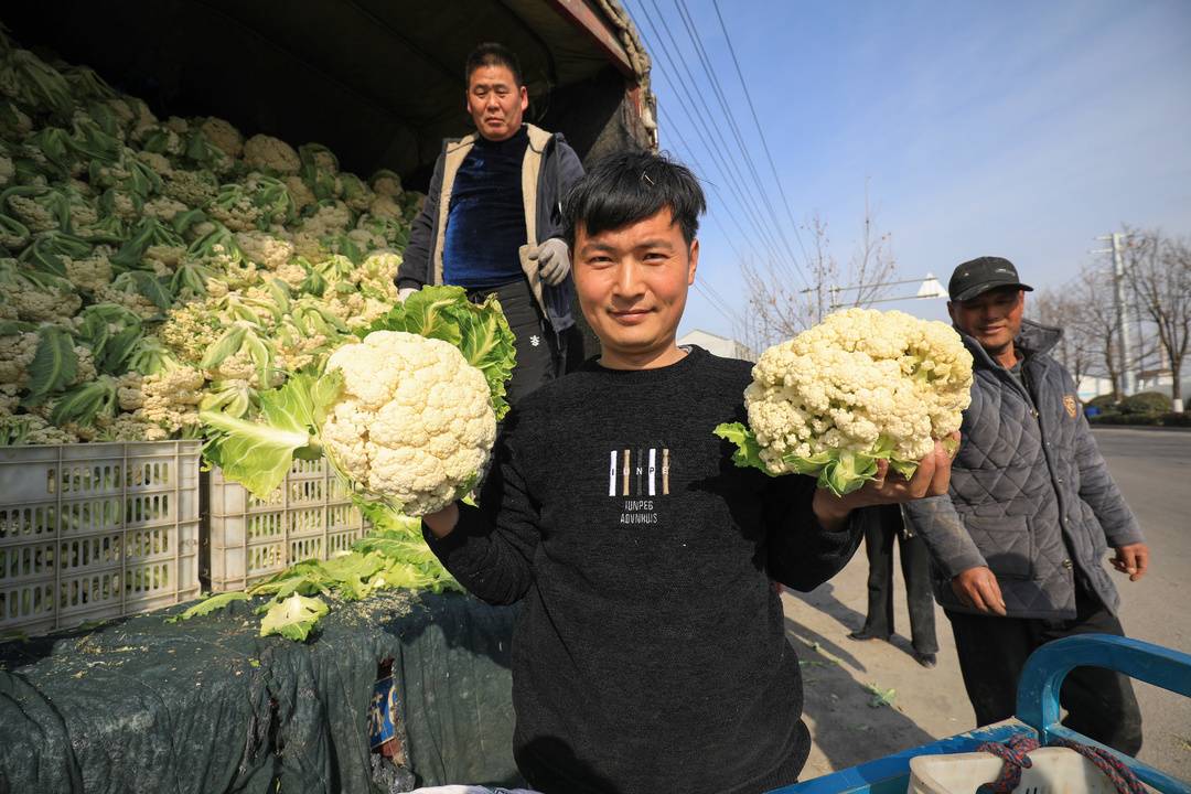 在村头的一个收购点,来自邳州的收购商杜杰吉,正在跟36岁的种植户孙大成一起,把三轮车上的菜花搬到货车上。他们不是一筐筐地往车上搬,而是一棵棵地往车上放,“每棵都要检查,品相不好的要挑出来。”杜杰吉告诉记者,能装6000斤菜花的货箱里,已经整齐码放了5000多斤。