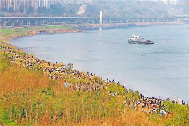 2月27日,重庆九龙坡,市民在经过生态修复后的长江九龙滩消落带上休闲游玩。特约摄影 钟志兵/视觉重庆