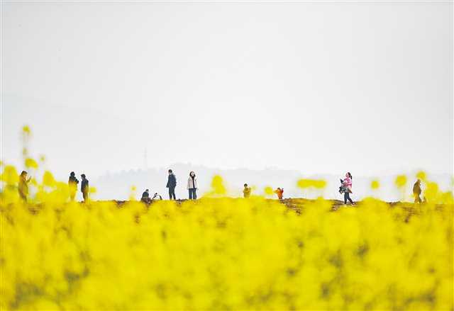2月27日,重庆广阳岛,市民在油菜花田旁迎着阳光放风筝。谢智强摄