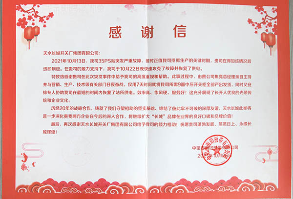 12月8日,长开厂集团公司收到了来自中铝西南板带有限公司发来的感谢信和锦旗,对集团公司的紧急救援并迅速恢复供电、有效降低损失表示感谢。