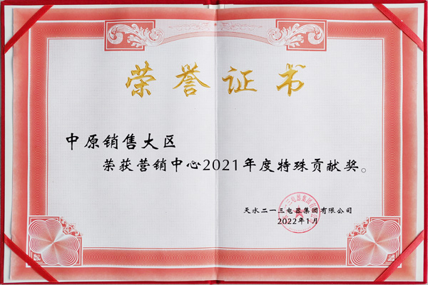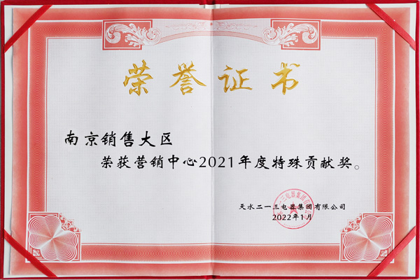 为表彰优秀、鼓励先进、树立典范、鼓舞斗志,进一步激发营销人员的工作热情,2021年度销售回款过亿元的中原销售大区和南京销售大区被营销中心授予二一三电器集团“特殊贡献奖”荣誉。
