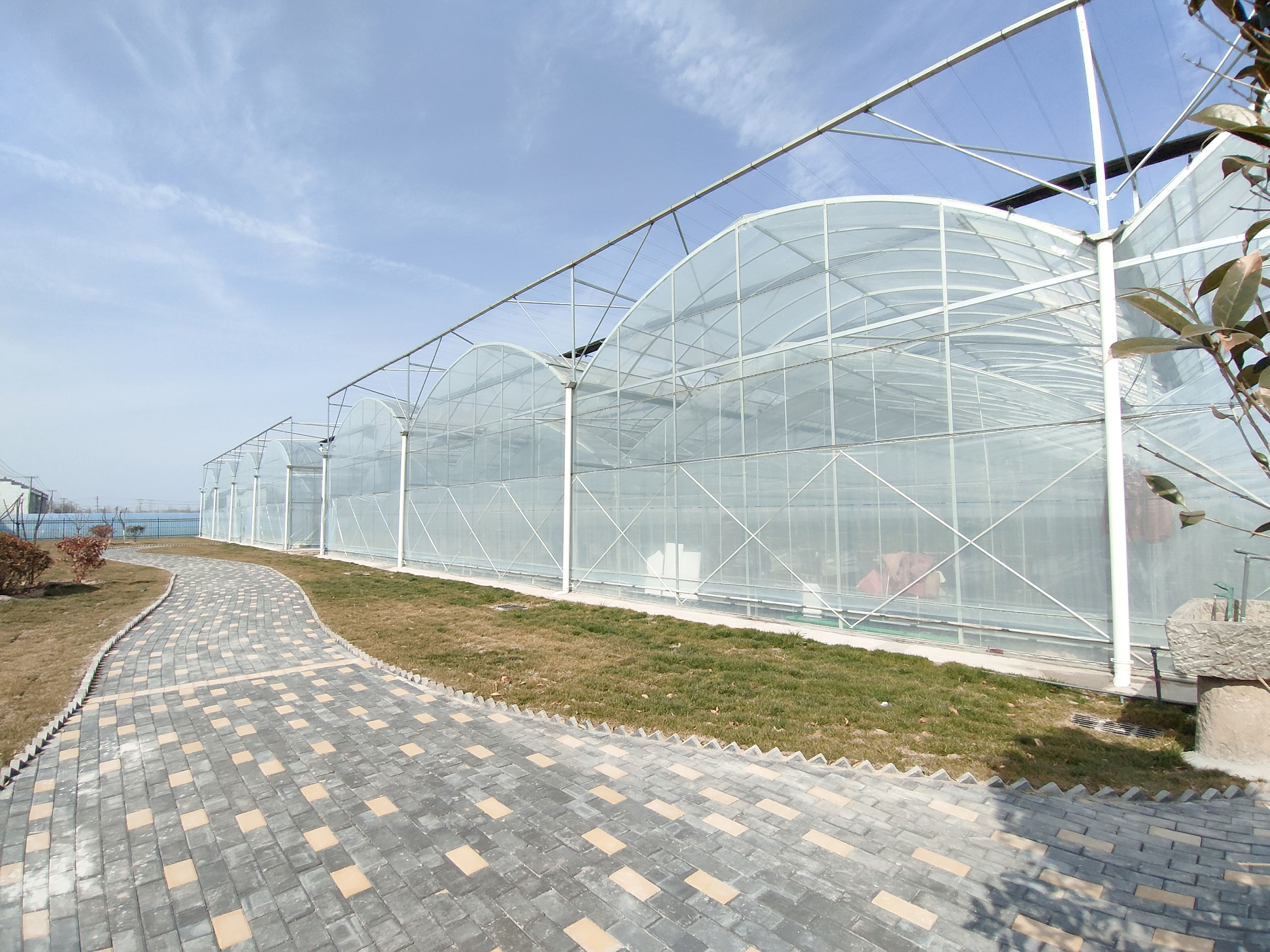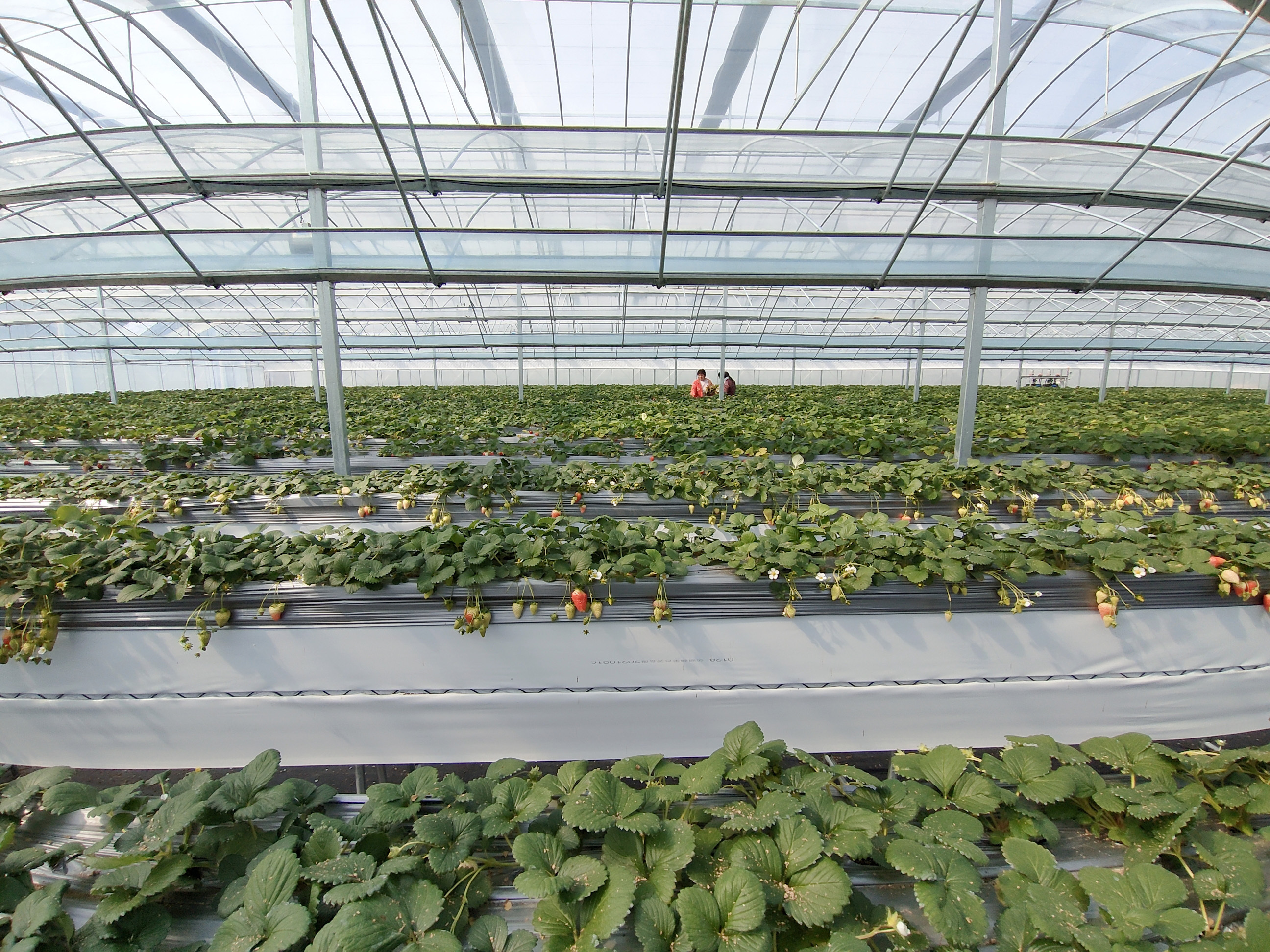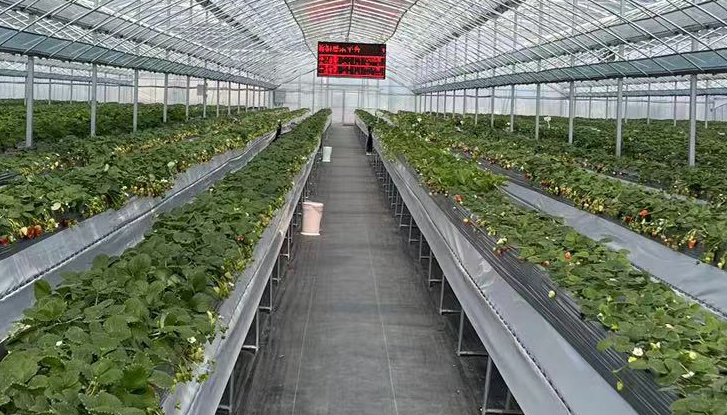 为推动草莓产业转型升级,2021年9月,园区投资近300万元,利用10亩集体土地建设现代设施草莓采摘示范基地,共建设6联栋温室棚和4联栋温室棚两座,棚体高约6米,顶层覆有三层膜,保温性能更好,棚内建有精准水肥循环系统、智能温控系统、智能补光系统。