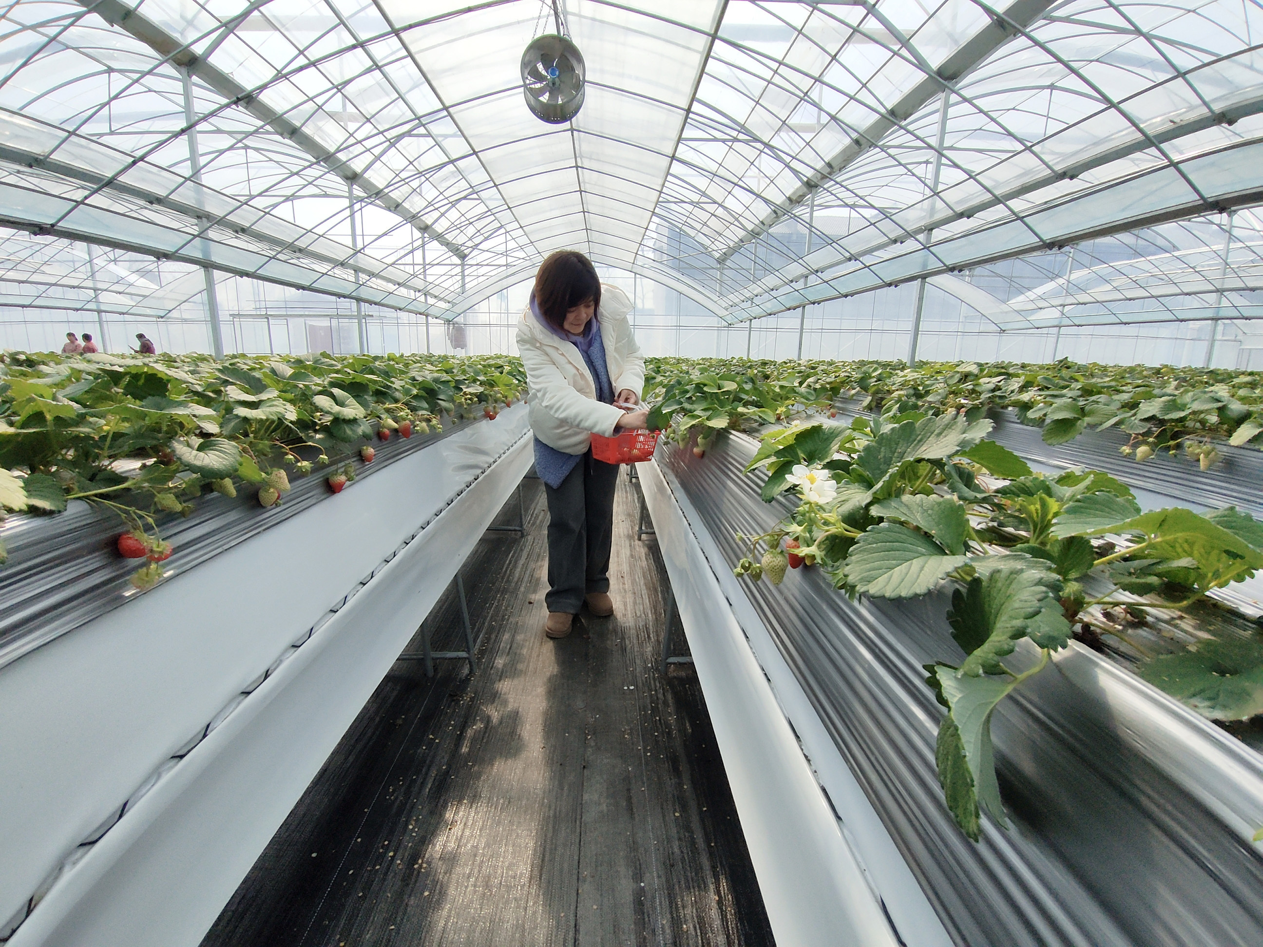 草莓采摘期长达5个月,从冬季持续到夏季。近年来,贾汪区大力推动农文旅深度融合,通过旅游热带动采摘热,促进草莓种植户增收致富。该基地10月栽苗,12月初首茬果上市,包含红颜、宁玉、妙香等多个品种。目前,二茬果子陆续成熟,正是采摘的好时节。市民房女士专程从徐州市区赶来采摘,她说:“我每年都来,这里的智能大棚感觉更方便,果子看着更干净清爽,人站着采摘也不累。”