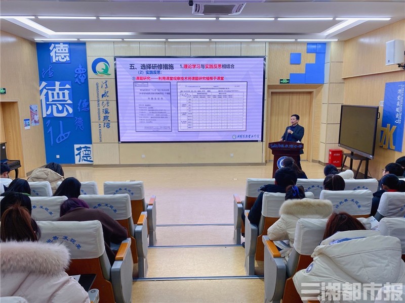 会上,湖南师范大学、长沙师范学院硕士研究生导师,全国“十一五”教育科研先进工作者,全国名师工作室联盟常务理事,人教社高中数学教材培训专家陈国军教授,为教师作了题为《名师工作室建设的行与思》专题讲座。他从研修团队的组建、研修目标的确立、研修文化的营造、研修思路的梳理、研修措施的选择、研修成果的推广六个方面出发,采用专业理论与亲历实践相结合的方式,深入浅出地对该校清溪名师工作室的创建与运行,进行详实细致的诠释。