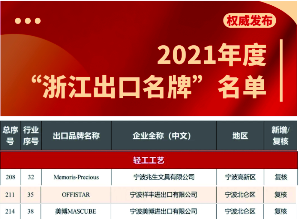 近日,浙江省商务厅公布了2021年度“浙江出口名牌”,宁波美博进出口有限公司“美博MASCUBE”、宁波兆生文具有限公司“Memoris-Precious”、宁波祥丰进出口有限公司“OFFISTAR”等企业品牌榜上有名。