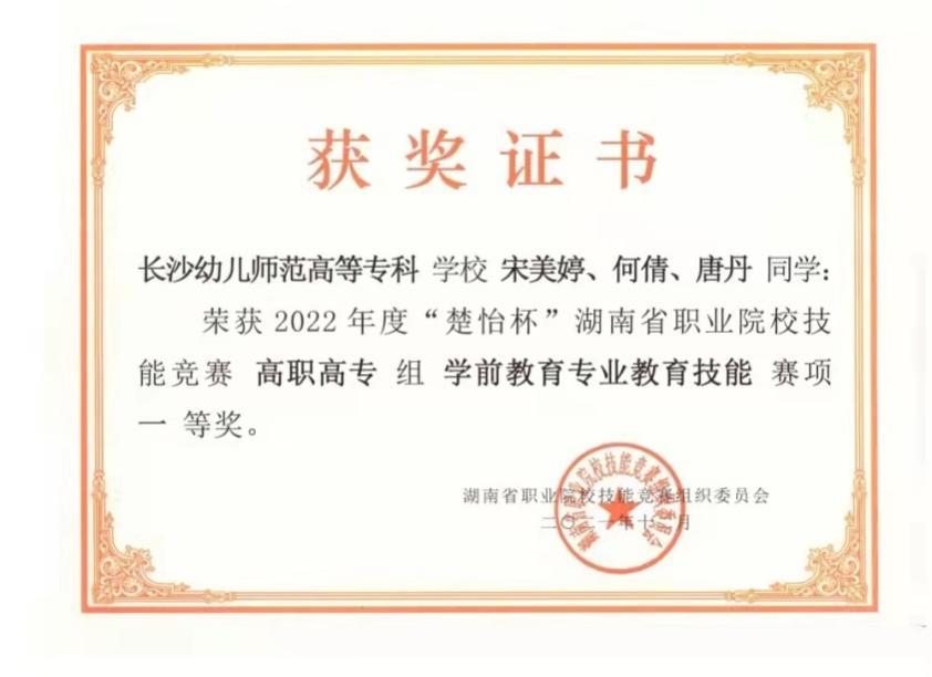 2021年12月31日,2022年度“楚怡杯”湖南省职业院校技能竞赛高职高专组学前教育专业技能赛项圆满落下帷幕。长沙幼儿师范高等专科学校学前教育专业派出2支队伍,分别荣获一等奖和二等奖的优异成绩,成为湖南省职业院校技能竞赛中的黑马选手,充分展现了学生扎实的专业技能和过硬的综合素养。