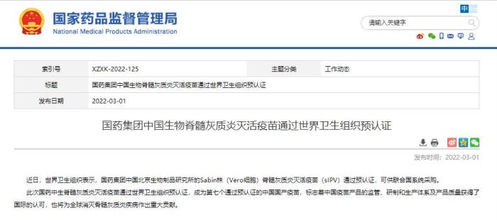 据介绍,此次国药中生脊髓灰质炎灭活疫苗通过世界卫生组织预认证,成为第七个通过预认证的中国国产疫苗,标志着中国疫苗产品的监管、研制和生产体系及产品质量获得了国际的认可,也将为全球消灭骨髓灰质炎疾病作出重大贡献。