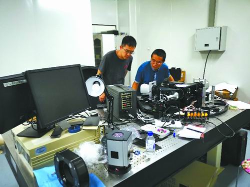 康喆(左一)与同事进行望远镜终端设备研制测试试验。 长春人卫站供图