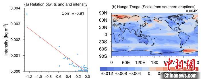 a过去千年模拟火山爆发后次年地表温度异常与火山爆发强度间关系。b估算汤加火山爆发对全球地表温度影响。 中科院大气所 供图