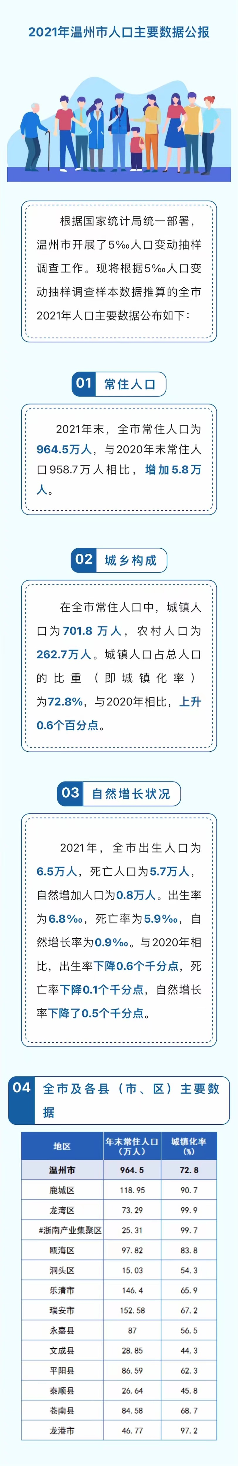 温州网讯 近日,温州市统计局发布温州市常住人口公报,2021年,温州市开展了5‰人口变动抽样调查工作,2021年末,全市常住人口为964.5万人,与2020年末常住人口958.7万人相比,增加5.8万人。