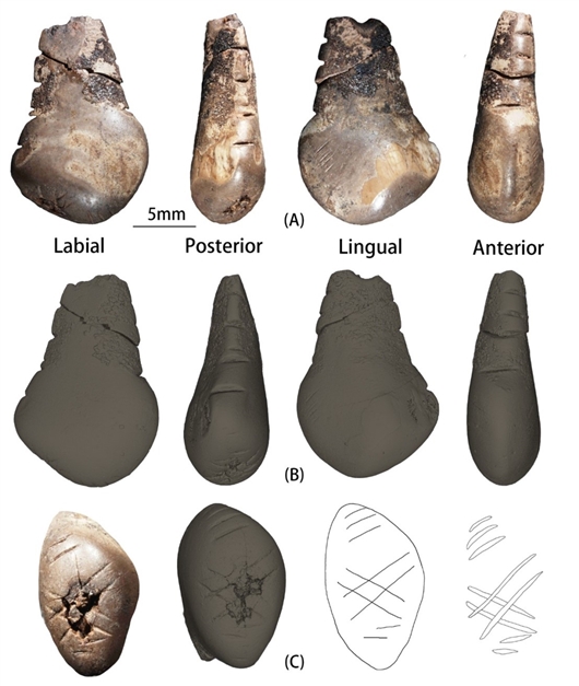 通过对该牙齿标本生物学特征的观察分析,研究人员认为它是马鹿(Cervus elaphus)的右上犬齿,属于一个年龄约6-11岁的雌性个体。鹿牙装饰品的技术分析结果显示,齿根端部细小而规整的残留孔径应是古人类以复合钻技术分别由颊舌两侧对钻而成的;牙齿根部和冠面出现的多组复杂刻划纹饰则是由2-3位工匠以多件石制工具分别雕刻完成,且其中至少1人惯用左手。