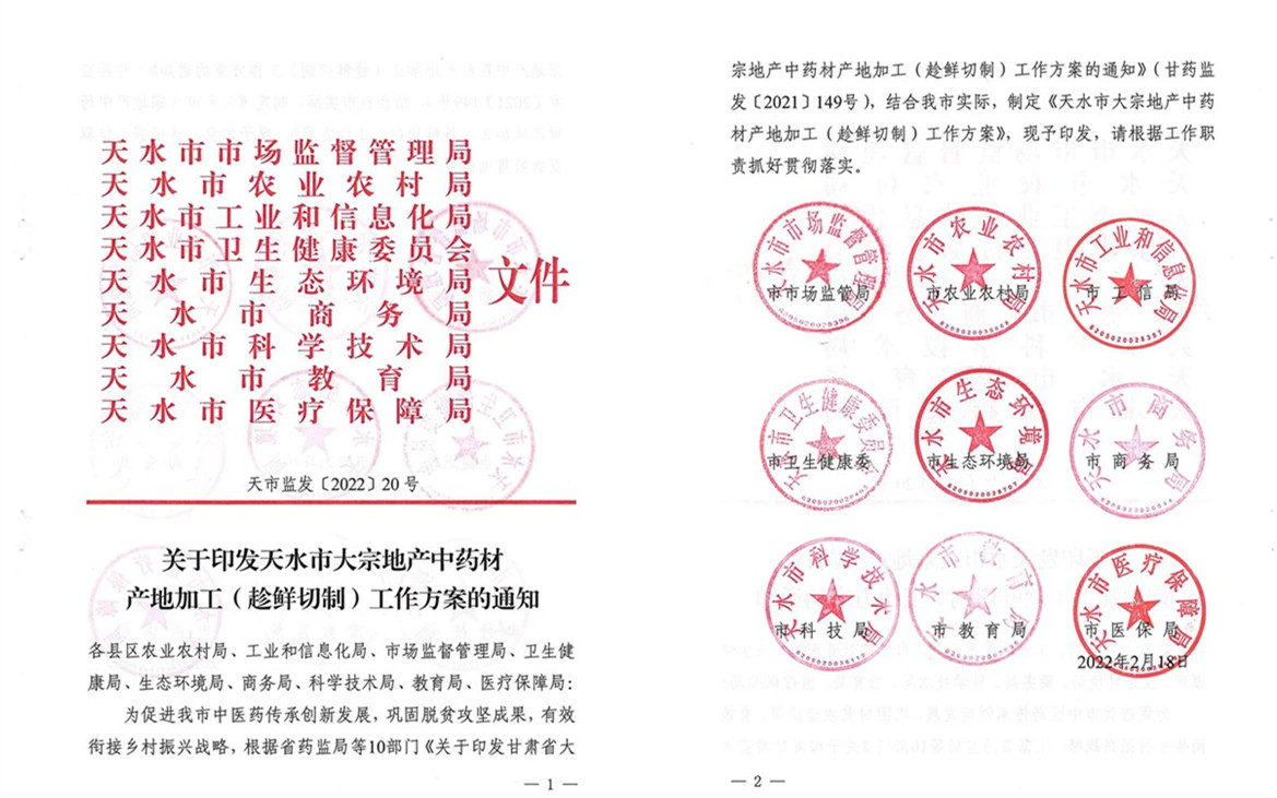 为深入贯彻落实习近平总书记关于中医药工作重要指示精神,进一步推进中药材产地加工标准化、规范化建设水平,促进中医药产业传承创新发展。近日,天水市市场监管、农业农村等9部门联合制定出台了《天水市大宗地产中药材产地加工(趁鲜切制)工作方案》,规范从种植、生产到使用全过程质量安全监管,推进我市中医药产业高质量发展。