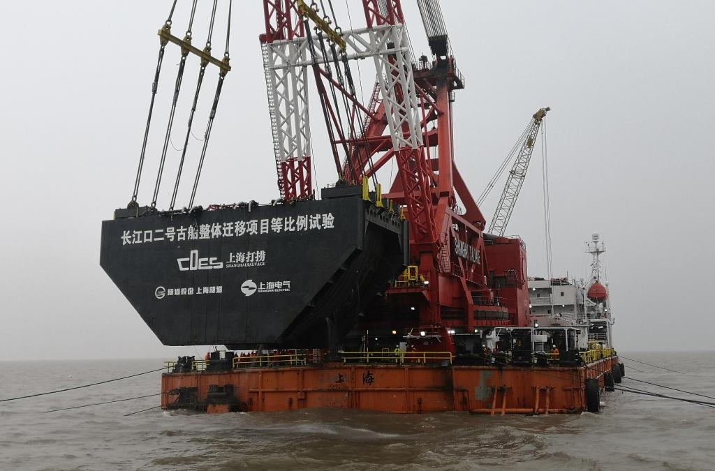 1月26日拍摄的“长江口二号”古船整体迁移项目等比例试验现场。