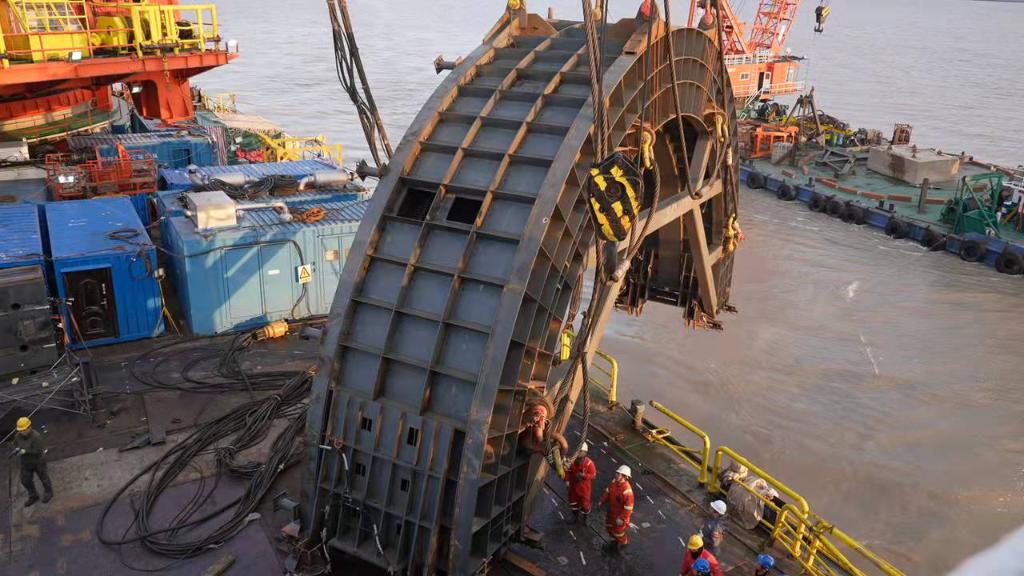 第一步,打捞人员从打捞船上把端板顶梁组合体吊入长江口水下,沉入泥中预设位置;