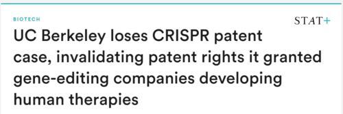 STAT网站发表题为《加州大学伯克利分校在CRISPR专利案中败诉,它授予基因编辑公司开发人类疗法的专利权无效》的报道