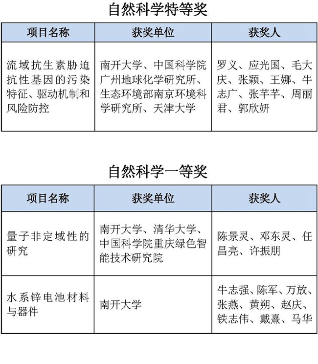 陈省身数学研究所陈景灵教授领衔完成的“量子非定域性的研究”项目、化学学院牛志强教授领衔完成的“水系锌电池材料与器件”项目荣获自然科学一等奖;药学院陈悦教授领衔完成的“提升萜内酯成药性及突破血脑屏障的结构优化策略”项目、生命科学学院马挺教授领衔完成的“油藏微生物定向调控大幅度提高原油采收率技术及应用”项目荣获技术发明一等奖;电子信息与光学工程学院刘伟伟教授领衔完成的“宽光谱在轨空气污染监测技术”项目荣获科学技术进步一等奖。