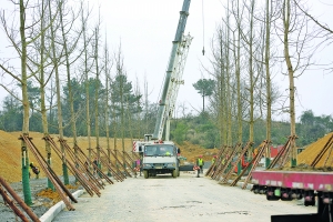 在贵安新区高铁站前加密路网工程现场,大型机械正在吊卸绿化苗木。