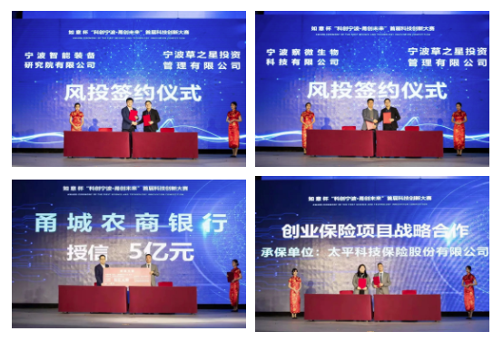 在风投签约环节,获得本次比赛创新项目一等奖的宁波智能装备研究院有限公司、宁波察微生物科技有限公司成功牵手宁波草之星投资管理有限公司。同时,宁波市科技创新大赛组委会与甬城农商银行、太平科技保险股份有限公司正式签约,为项目成功落地保驾护航。