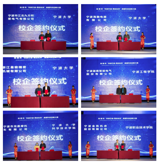 据介绍,大赛的创立初衷旨在助力产业转型升级,聚焦现实效益,实现成果产业为最终目标,为此邀请了各大机构与优秀项目进行签约合作。在校企合作方面,宁波大学与宁波市江北九方和荣电气有限公司、宁波海融电器有限公司、浙江易锻精密机械有限公司三家企业的创新项目签约。宁波迦南智能电气股份有限公司、宁波市龙嘉摩托车有限公司、宁波金凯机床股份有公司研发的创新项目分别与宁波工程学院、宁波大学科学技术学院、宁波职业技术学院签约。