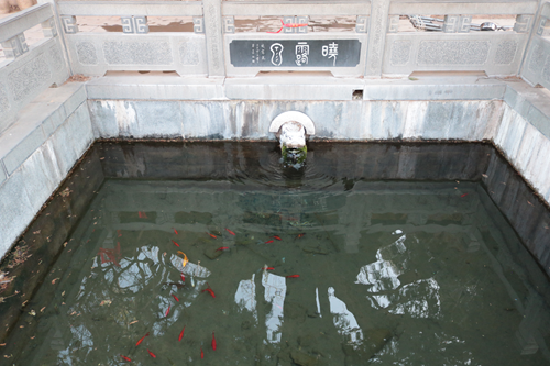 2022年3月5日上午九点,我们的节水保泉活动第一站来到隐藏于小山村的济南七十二名泉之一的晓露泉。晓露泉位于长清区张夏镇积家峪村东北悬崖之下,泉池大约15m2,是由青石板砌成,呈长方形,围栏有十二根石柱,在泉池东壁雕刻有汉白玉的龙头,泉水从龙口中汩汩流入池内,在池中溅起一团雪白的水花,龙头的正上方是著名书法家蒋维松先生用篆书题写“晓露泉”三个字。虽然水池内有少许落叶,但泉水却依然清澈见底,池中的锦鲤也欢快地游来游去,站在池边,欣赏着山中的景色,令人心旷神怡。