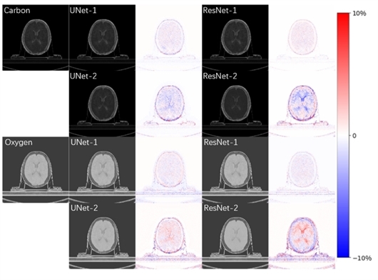 在线监测的原理是利用质子束通过核反应诱导产生的正电子素(11C和15O为主要来源),并借助人工智能算法,快速准确地重建出辐射剂量分布。因此,获取人体组织的碳氧元素是非常重要的一步。传统基于单能CT的校准算法在分析人体组织(尤其是软组织)的成分时存在较大误差,限制了基于机器学习的在线剂量监测框架的应用。相比于单能CT,双能CT重建出两个不同能量下的图像,能提供更多维度的人体组织特征信息。团队利用UNet和ResNet两个模型,在软组织和低密度组织中实现了碳氧成分的准确估计(低于5%的误差)。相比与传统的单像素点方法,机器学习模型充分利用了图像的空间相关性,对图像噪声和伪影也表现出了更好的鲁棒性。这一研究成果不仅可以用于改善治疗计划,也可以用于提高机器学习所需的训练数据的准确度。