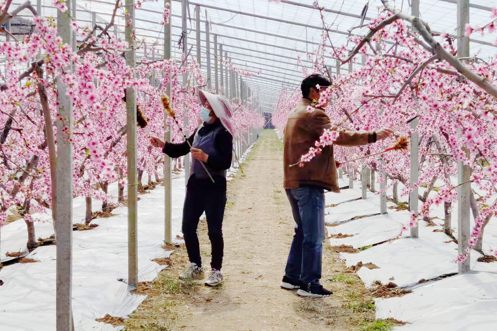 走进双塘镇孟庄村的大棚内,一株株桃树上桃花竞相怒放。为了不误花期,一大早农技人员郭广胜就来到了棚内,细致地向种植户刘敏传授种桃经验。