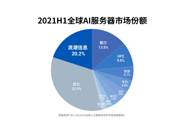 在2021H1全球AI服务器市场中,浪潮信息、戴尔、HPE分别以20.2%、13.8%、9.8%的市占率位列前三,三家厂商总市场份额占比达43.8%。