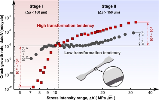 研究表明,马氏体相变对疲劳裂纹扩展的影响存在着两面性。在短裂纹阶段,马氏体相变可起到抑制疲劳裂纹扩展的有益作用,可使疲劳裂纹扩展速率降低高达2个数量级;而在长裂纹阶段,马氏体相变却起到加速疲劳裂纹扩展的相反作用。进一步的机理研究揭示,马氏体相变可诱发两种具有对抗性的疲劳机制,即起抑制裂纹扩展作用的相变介导裂纹滞止和起促进裂纹扩展作用的相变介导裂纹合并其分别在短裂纹阶段和长裂纹阶段起主导作用。研究深入分析了这两种疲劳机制的成因,证明其来源于相变产物马氏体自身所具有的“硬而脆”的内禀特性,而并非来源于相变过程本身(如裂纹闭合效应)。