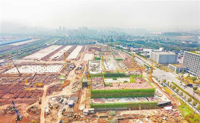 3月9日,位于沙坪坝区的重庆国际物流枢纽园区,陆海新通道重庆无水港项目正在加紧建设。