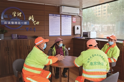 环卫工人们在龙翔湖城管驿站聊天、休息。 龙湾区综合行政执法局供图