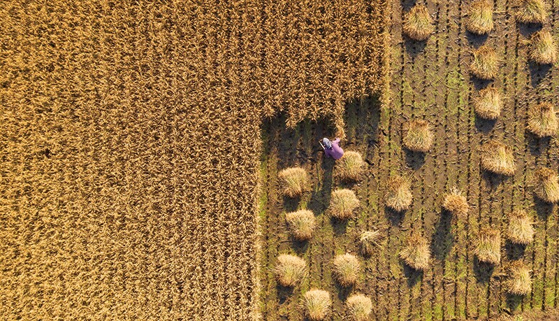 2021年10月29日,河北省滦州市滦城街道小横山营村农民收获水稻 朱旭东摄/本刊