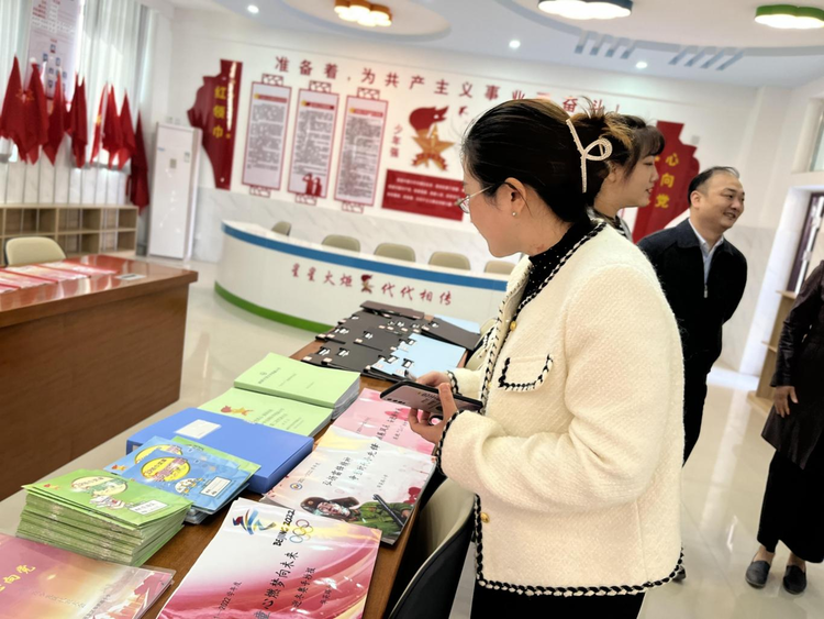 在华英路小学党支部书记吕永梅同志及少先队相关负责人的陪同下,调研组参观了华英路小学少先队大、中队活动阵地,认真查阅学校“红领巾奖章”的实施、分批入队等相关材料。