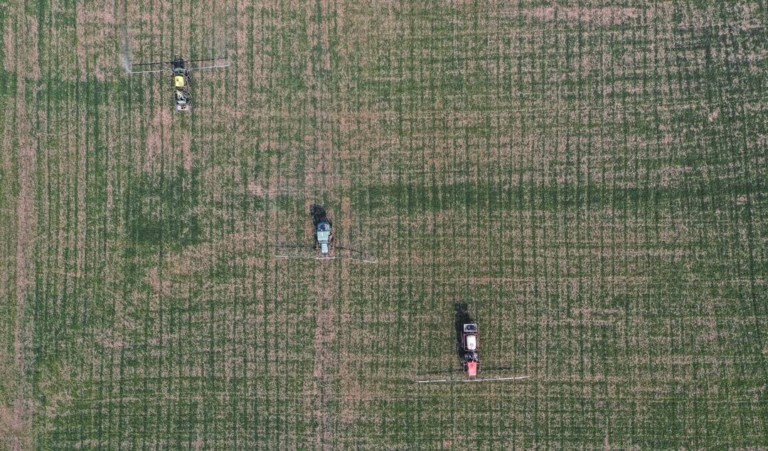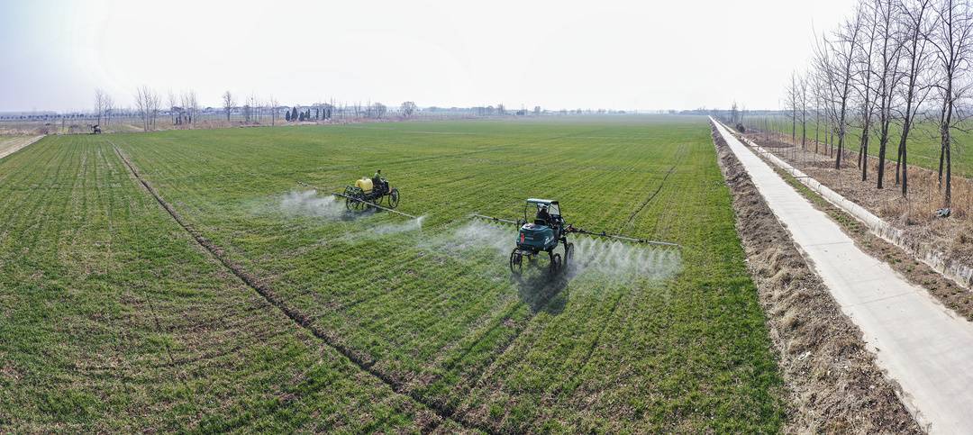 近日,徐州市铜山区沿湖农场王倩家庭农场的地头上,一派繁忙的景象——撒肥机和无人机在绿意渐浓的田野里恣意“撒欢”,不大一会工夫,几百亩麦田的喷药便完工了。