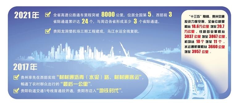 过去几年,交通的跨越式发展极大提升了贵州在区域发展中的战略地位,呈现出“一年一变样,三年上台阶,五年大跨越”的发展态势。在西部率先实现“县县通高速”,在此基础上接续实现“村村通沥青(水泥)路”“组组通硬化路”,8000多公里高速公路和1.2万座桥梁、2100多条隧道架起500多平方公里的“高速平原”,使得贵州已经从西南地理枢纽转变为西南陆路交通枢纽;北上长江夙愿得偿,千里乌江全线复航;贵阳成为全国高铁枢纽之一,形成了贯通京津冀、长三角、珠三角、粤港澳、川渝滇等地区的高铁通道;9个市(州)均有机场。今日之贵州,高铁飞驰,路网密布,高山出平原,天堑变通途,正阔步迈向现代化交通新征程。