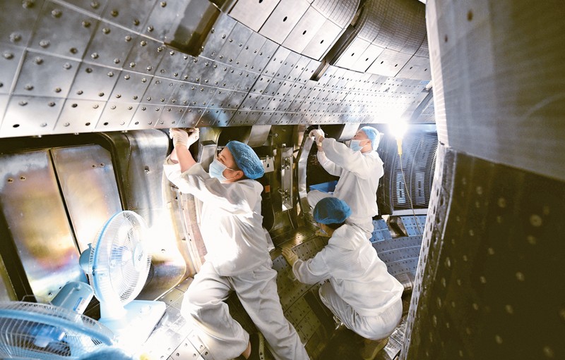 2021年5月28日,中国科学院合肥物质科学研究院有“人造太阳”之称的全超导托卡马克核聚变实验装置(EAST)创造新的世界纪录,成功实现可重复的1.2亿摄氏度101秒和1.6亿摄氏度20秒等离子体运行,向核聚变能源应用迈出重要一步。图为工作人员对全超导托卡马克核聚变实验装置(EAST)进行升级改造。新华社记者 周牧/摄