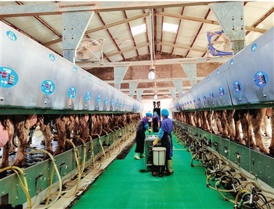宁夏翔达牧业科技有限公司的奶牛在挤奶台上有序挤奶。