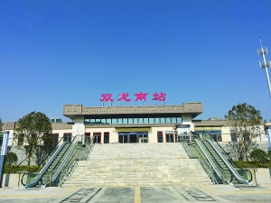 双龙南站位于双龙航空港经济区小碧乡马寨村,站房形式为线侧平式车站,钢筋混凝土框架结构,建筑层数为地上一层,建筑面积959.14平方米,设2站台4线,站台尺寸均为长230米、宽8米、高1.25米,站台雨棚总面积3680平方米。预计客流高峰期间,每小时上下客人数410人。