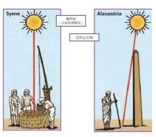 人类最早对地球直径与周长的测量是在公元前200多年,也就是中国秦始皇那个时代。当时古希腊的数学家、地理学家、天文学家、著名的埃及亚历山大图书馆馆长埃拉托斯特尼(Eratosthenes,公元前280~前190年)利用巧妙的测量方法粗略测量了地球的大小。据说当时在亚历山大港(Alexandria)以南与之几乎同经度的塞伊尼(Syene,大致相当于现在埃及南部的阿斯旺地区)有一口很深的竖井,每到夏至日(即每年6月21或22日,这天太阳直射北回归线)这天的正午,太阳光能够一直照射到井的最底部。