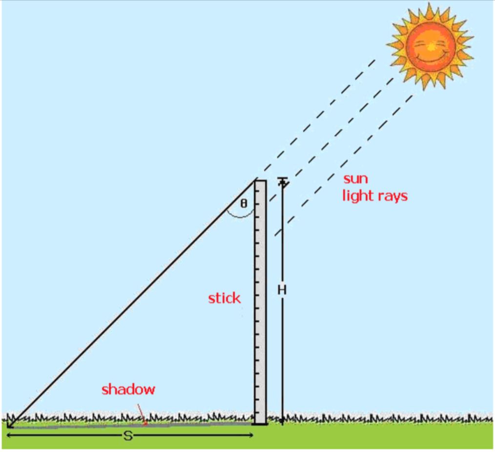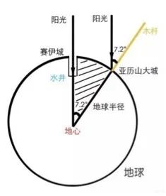 也就是说,在那个地方夏至日正午太阳位于正天顶,其入射角为0度。然而在位于埃及北部尼罗河三角洲地中海沿岸的亚历山大港,夏至日正午时太阳却无法直射地面,因此埃拉托斯特尼使用一根高塔(如方尖碑)采用测量影子长度的方法来测量太阳照射的角度。使用简单的几何学知识,他测出太阳光的入射角为7.2度。