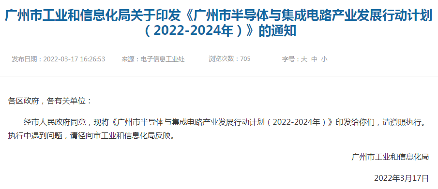 近日,广州市工信局对外公布《广州市半导体与集成电路产业发展行动计划(2022-2024年)》(下称《行动计划》)提出,到2024年,年主营业务收入突破500亿元,年均增长超过15%。