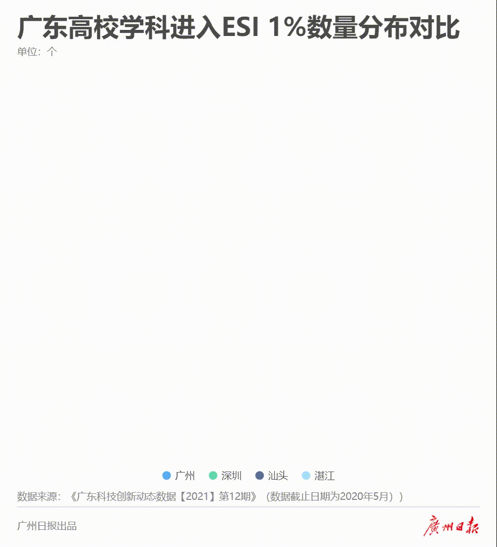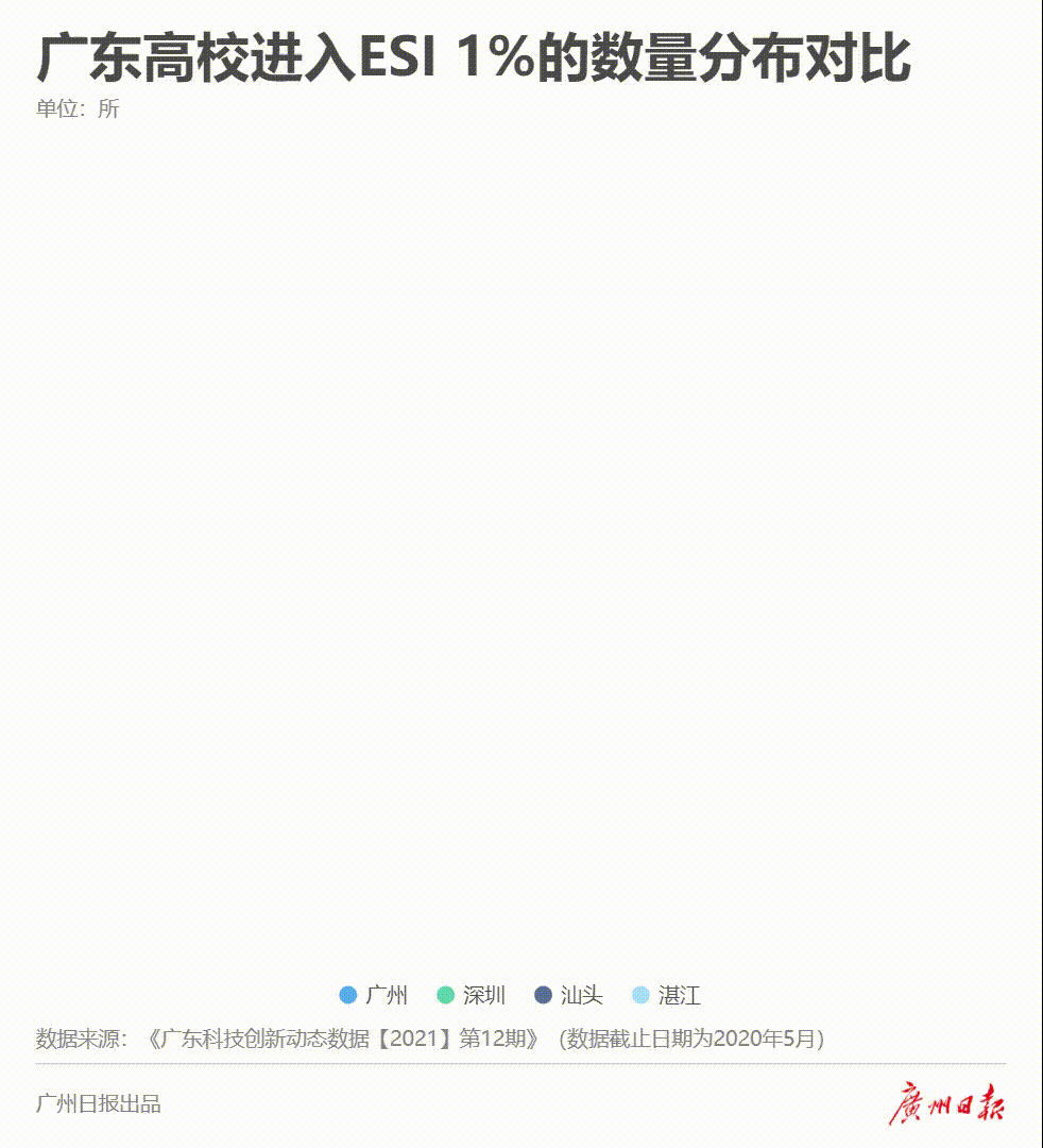 “大院大所大装置大平台”是打造科创新高地的重要载体,而广州恰恰具有大院大所集聚的优势。数据列出广东高校学科建设情况(数据截止日期为2020年5月),广东全省进入ESI 1%的大学数为15家,广州占据11家;广东高校学科进入ESI 1%的学科数为86个,广州拥有74个。广东全省进入ESI 1‰的两所大学和8个学科也均在广州。