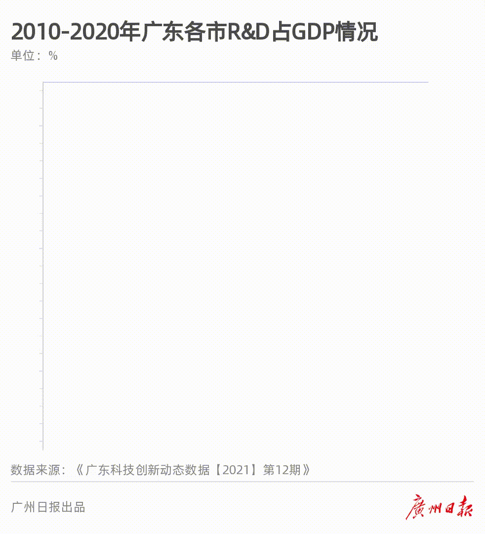根据《创新数据》中“2010-2020年各市R&D/GDP情况”显示:这十年来,广州在“R&D经费支出占GDP的比重”上存在一定短板。2020年广州“R&D经费支出占GDP的比重”为3.1%,位于全省第四,位列深圳、东莞、珠海之后。