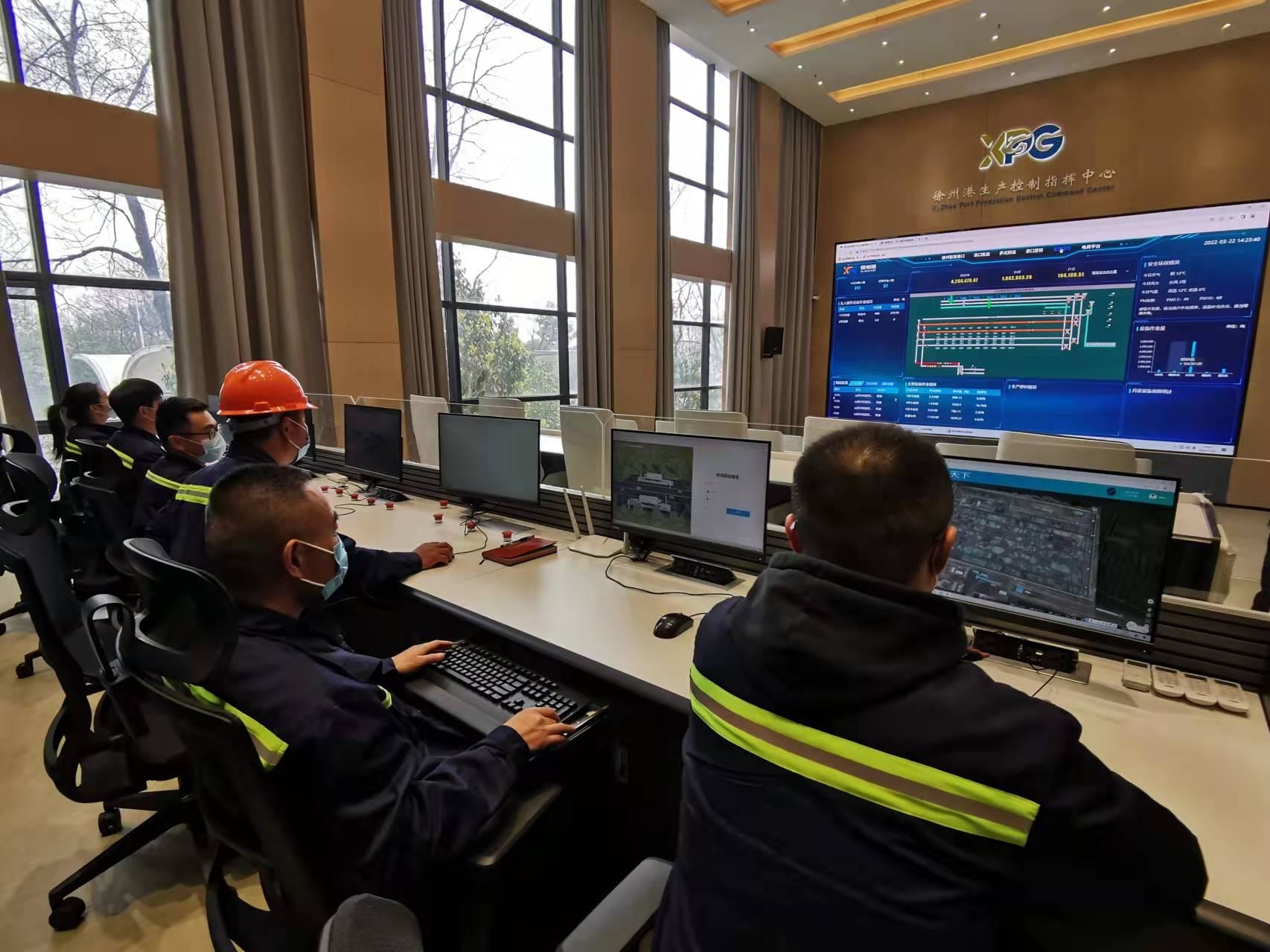 在徐州港生产控制指挥中心铁水联运信息平台上,基于列车、船舶、汽车的物联网定位和大数据分析技术,港口吞吐量、进货量、货种比例、流量流向、运输方式、铁路到发、码头装卸、公路进出、港内转栈、货区仓储等信息直观显示在三维系统图中,实现港区一体化智慧管理。