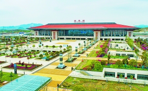贵安站位于城市区域规划主轴线上,车站设计与站区规划与城市发展、景观相互协调。站房“黔之韵”——“巍巍黔阙显神韵、碧瓦朱檐挂虹霓”的寓意造型,与新区整体城市设计相协调,成为城市绿轴上最重要的标志性建筑。站房造型形象鲜明,现代大气,凸显时代精神。