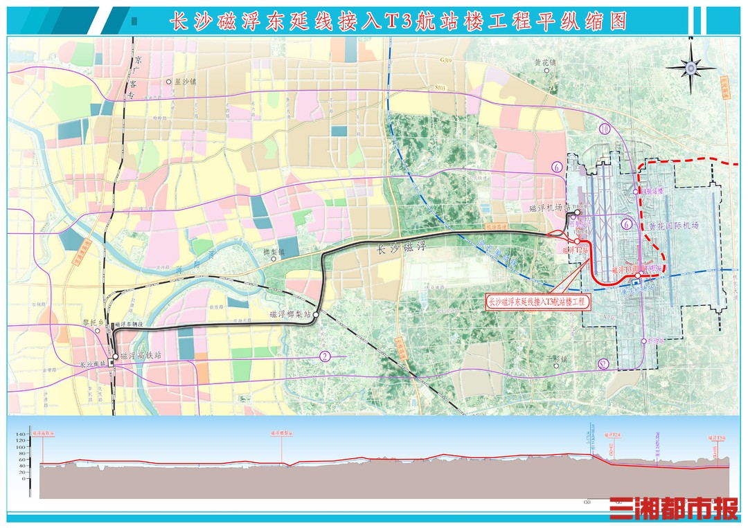 长沙磁浮东延线接入T3航站楼工程是配套长沙机场改扩建工程,实现高铁站与新建T3航站楼间快速接驳,扩大空铁联运综合交通枢纽效应的重要工程。线路自长沙磁浮快线黄金大道特大桥引出,出岔后线路以高架形式上跨临空大道,右线从机场管理集团北侧后山入地,左线下穿长沙磁浮快线机场高速特大桥后入地。下穿机场大道高架桥后于T2航站楼西南侧停车场处设磁浮T2站,出站后向南绕过机场跑道后,向东接入T3航站楼设磁浮T3站。线路全长4.454公里,设车站2座,其中磁浮T3站与T3航站楼接驳,与地铁6号、10号线、S2线、渝长厦高铁换乘。该延长段建成后将实现高铁站与正在建设的T3航站楼间快速接驳,方便旅客高效通勤,进一步加强长沙机场与轨道交通的互联互通,提升航空服务水平和枢纽运营效率、加快构建现代化综合交通运输体系。